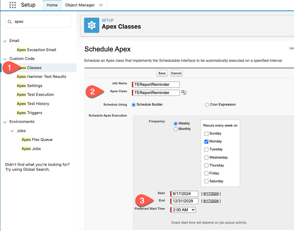 - The Apex Class is "TEReportReminder".